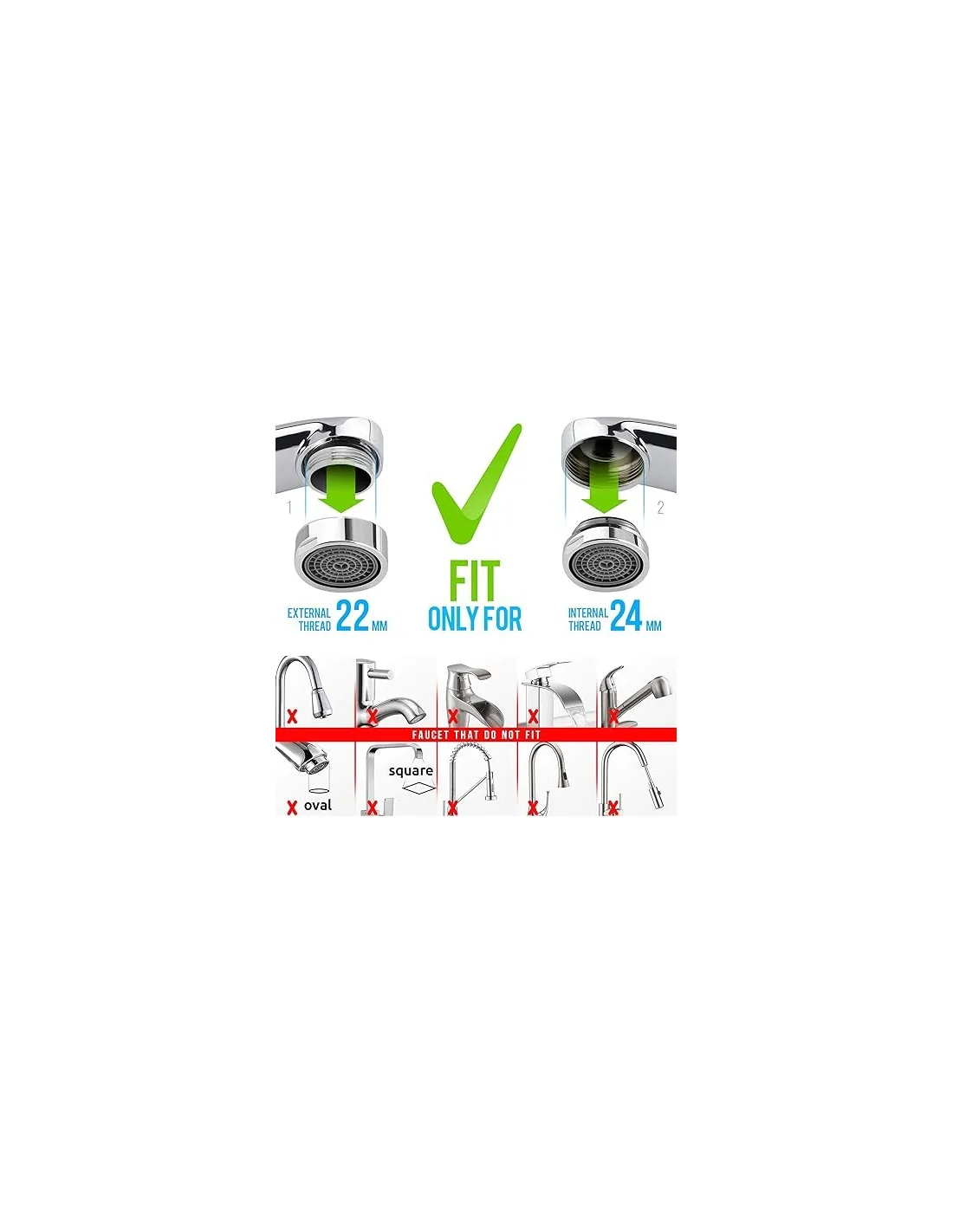 El filtro está diseñado para ser montado en los grifos con un hilo externo de 22 mm. Sin embargo, también tendrá un adaptador para grifos con hilo interno de 24 mm.