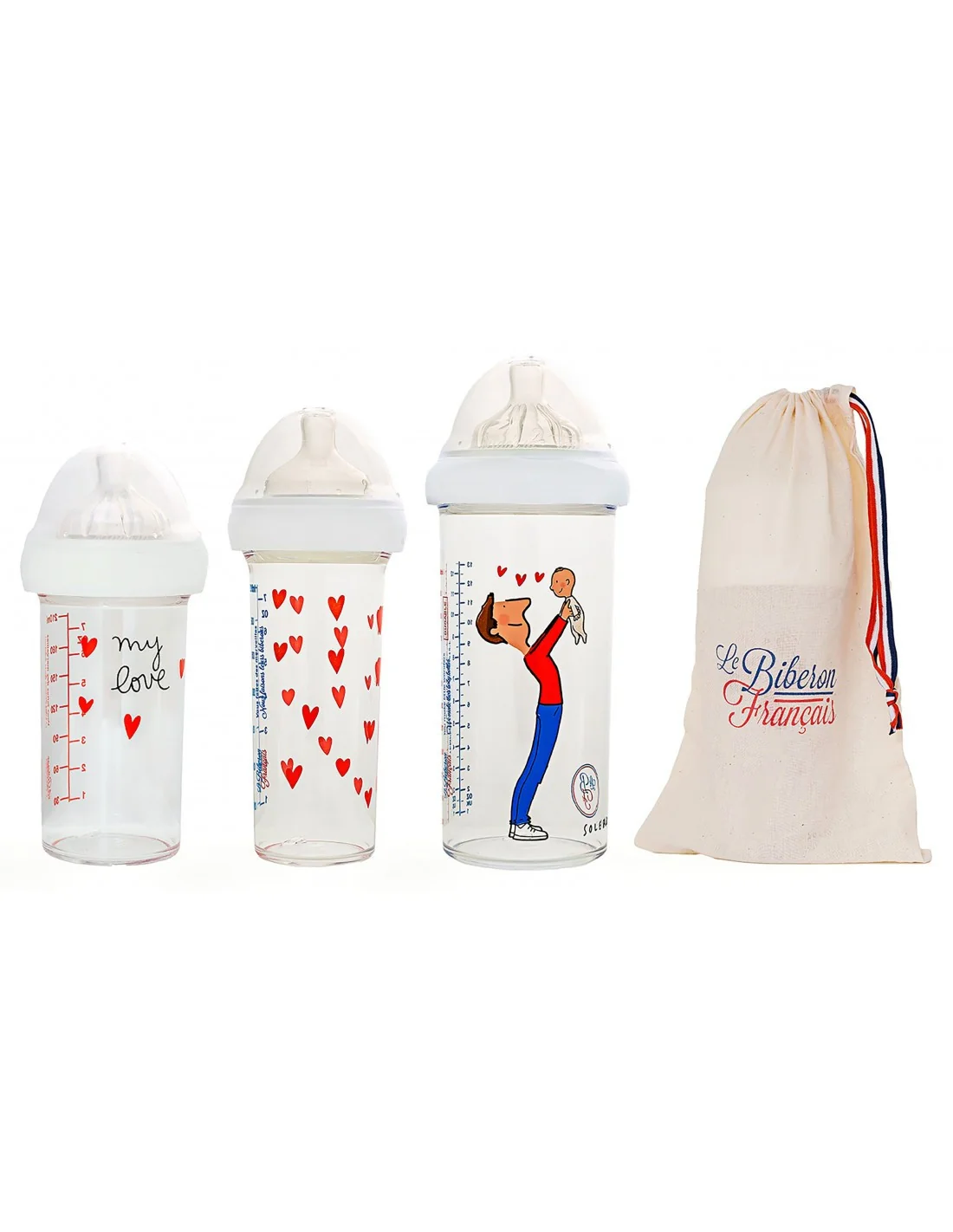Lot de 3 biberons Le biberon français comprenant un biberon 360 ml Maman et bébé (13 Oz) + 2 biberons 210 ml My love et Coeurs (7 Oz)