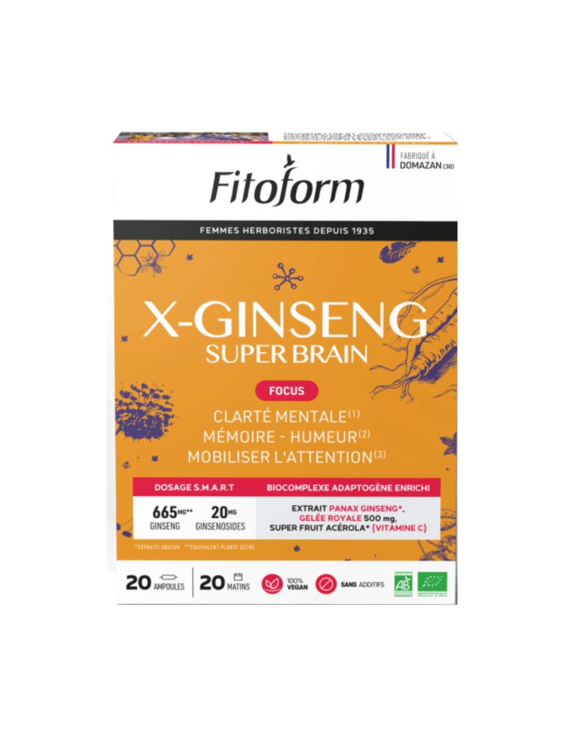 X-Ginseng Super Brain est un complément alimentaire 100 % biologique. Chaque ampoule associe du ginseng blanc titré à 20 mg de ginsénosides, 500 mg de gelée royale, et de la vitamine C naturelle issue de l'acérola (40 mg, soit 50 % des apports de référence journaliers). La formule est complétée par du jus de pomme concentré biologique pour un goût naturel, sans arôme ni édulcorant ajouté. Fabriquée en France selon un procédé de tyndallisation, elle est sans alcool, sans conservateur et certifiée Ecocert.