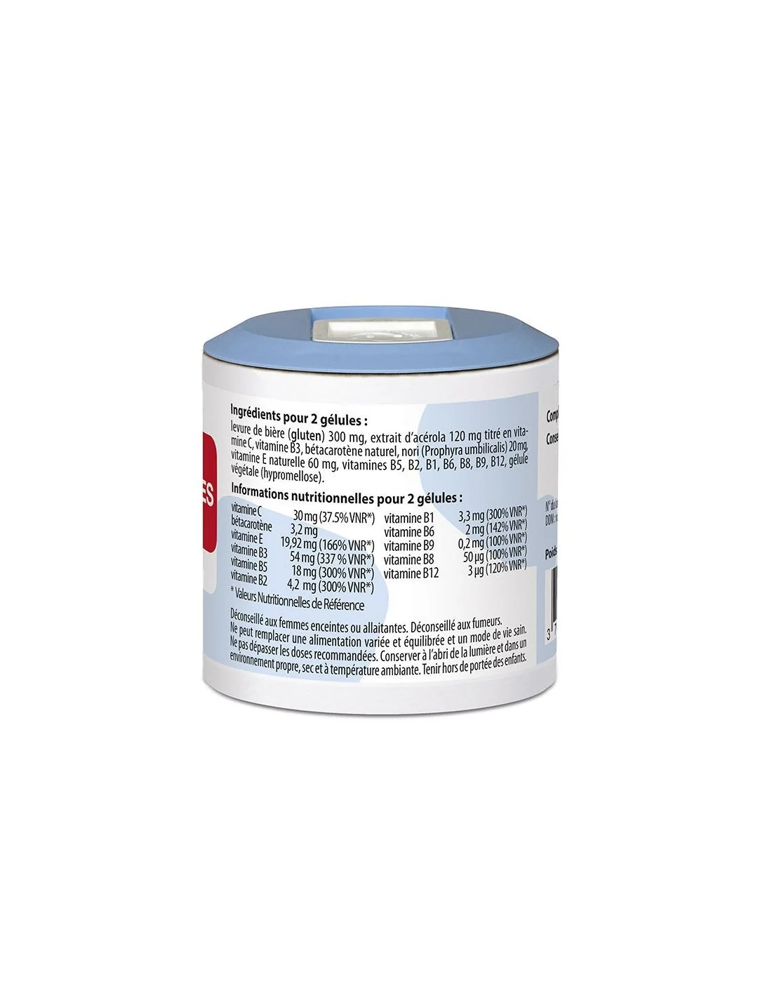 - Levure de bière (Gluten), Gélule végétale (hypromellose), Extrait d’Acérola titré en vitamine C, Vitamine B3, Bétacarotène naturel, Nori (Prophyra umbilicalis), Vitamine E naturelle, B5, B2, B1, B6, B8, B9, B12.